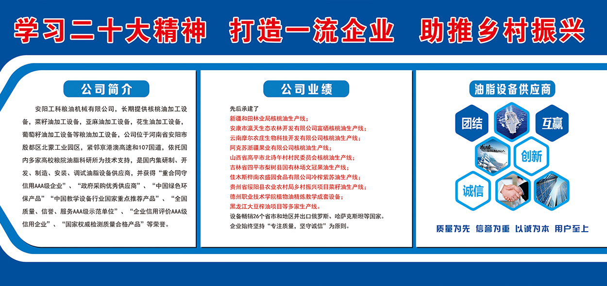 安陽工科糧油機(jī)械有限公司,長期提供核桃油加工設(shè)備,茶籽油加工設(shè)備,菜籽油加工設(shè)備,亞麻油加工設(shè)備,花生油加工設(shè)備,葡萄籽油加工設(shè)備等糧油加工設(shè)備,公司位于河南省安陽市殷都區(qū)北蒙工業(yè)園區(qū),緊鄰京港澳高速和107國道,是國內(nèi)集研制、開發(fā)、制造、安裝、調(diào)試油脂設(shè)備供應(yīng)商。先后承建了新疆和田林業(yè)局核桃油生產(chǎn)線,安康市瀛天生態(tài)農(nóng)林開發(fā)有限公司富硒核桃油生產(chǎn)線,云南摩爾農(nóng)莊生物科技開發(fā)有限公司核桃油生產(chǎn)線,阿克蘇浙疆果業(yè)有限公司核桃油生產(chǎn)線,山西省高平市北詩午村村民委員會(huì)核桃油生產(chǎn)線,吉林省四平市梨樹縣國有林場文冠果油生產(chǎn)線,,佳木斯樺南農(nóng)盛園食品有限公司冷榨紫蘇油...